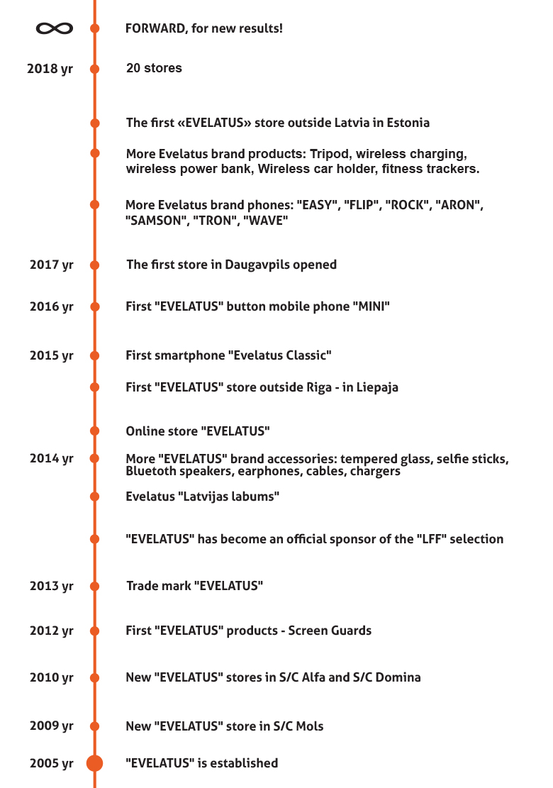 It all started with a small shop in a remote area of Riga. The company began its journey in 2005. However, only in 2009 it was coming into the malls. At the moment, the company Evelatus has got 25 stores in the largest shopping centers in Riga - Alfa, Domina, Spice, Mols, as well as in the largest towns - Liepaja, Daugavpils, Jelgava, Jekabpils, Ogre and abroad. Our stores offer mobile phones from more than 40 manufacturers. In addition to popular brands like Apple, Samsung, Huawei, this list includes: Ulefone, Doogee, Blackview and others that clients can only purchase in our stores. You can also find accessories for any phone at our stores.
